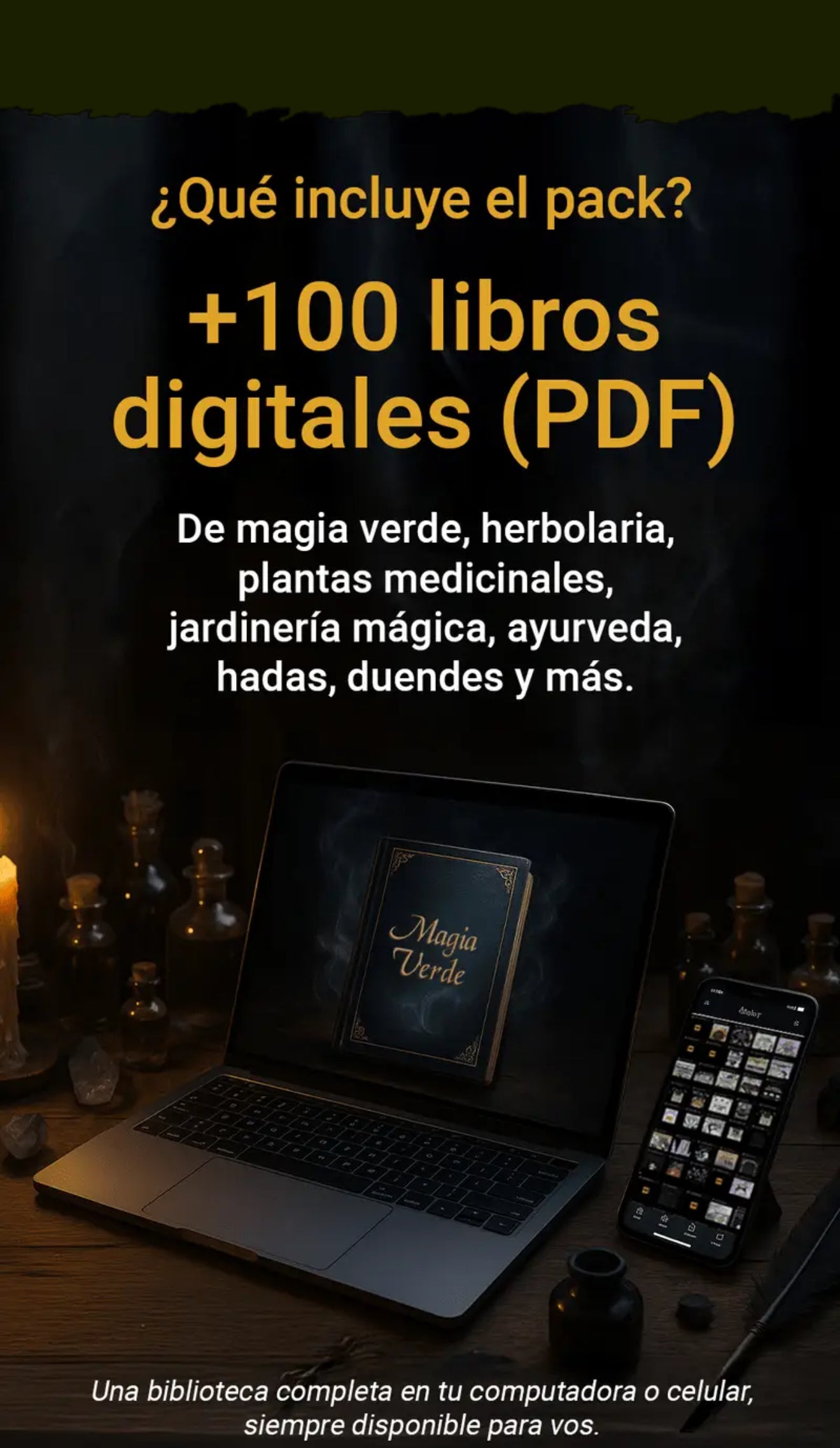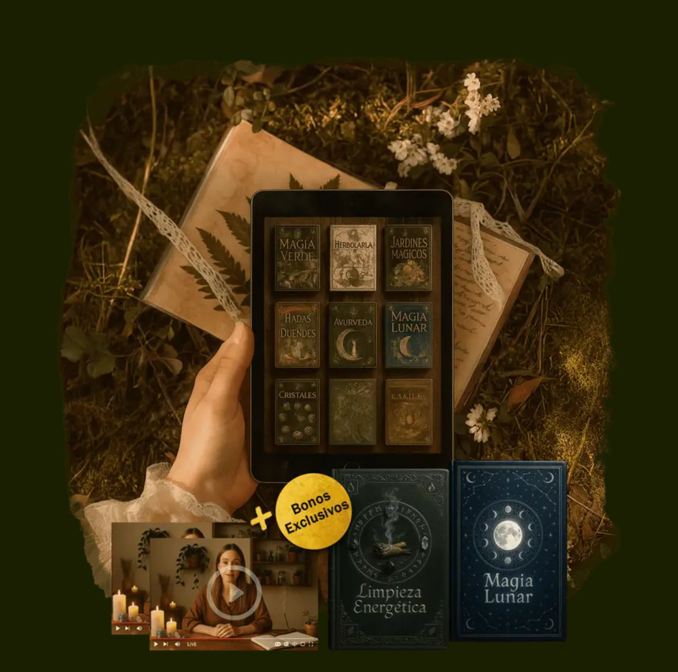 Incluye mรกs de 130 libros digitales en PDF, organizados en distintas temรกticas: magia verde, herbolaria, plantas medicinales, jardinerรญa mรกgica, ayurveda, hadas, duendes, magia lunar y mรกs. Una verdadera biblioteca mรกgica a tu alcance.